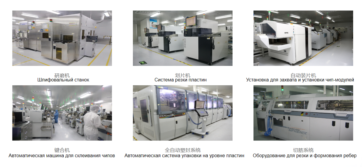 5 линий упаковки: 72 современных систем отечественного производства и иностранного производства, в том числе шлифовальный станок,система резки пластин, установка для захвата и установки чип- модулей, автоматическая машина для склеивания чипсов, автоматическая система упаковки на уровне пластин и пр.Современные оборудования и передовые технологии не только дают возможность повышать производительность упаковки продукта, но и обеспечивать